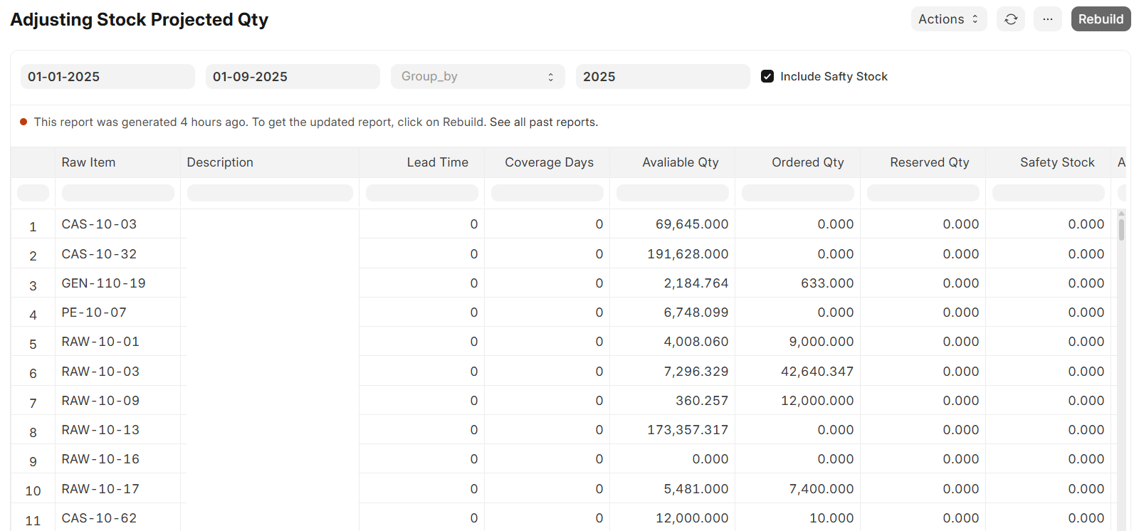 The Adjusting Stock Projected Qty Report calculates and displays the future inventory position for each item by combining current stock levels, purchase orders, sales orders, safety stock, and expected demand from the Expected Sales Forecast Report. It ensures accurate visibility of whether items are overstocked, balanced, or at risk of shortage.